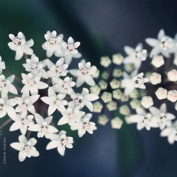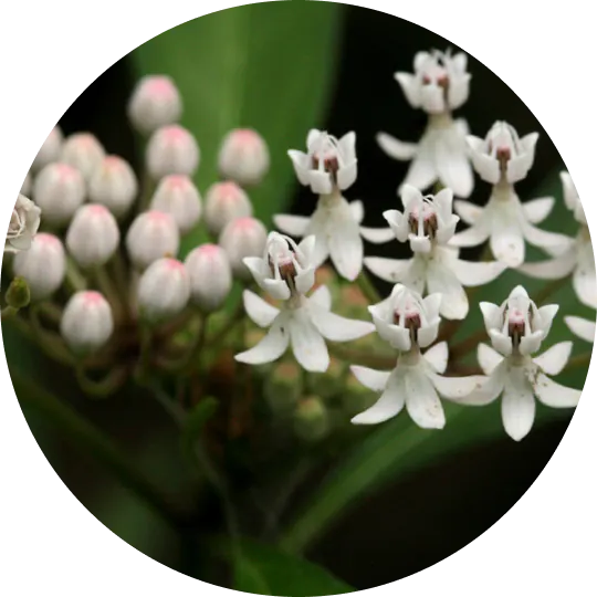 This host plant for monarch butterfly caterpillars is abundant with creamy white flowers tinged with soft pink, that sit in clusters on stalks with short narrow leaves. Ideal for rain gardens and partly-shaded moist environments.