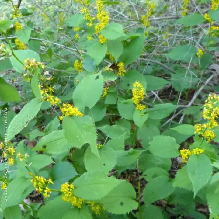 The captivating Zigzag Goldenrod is a stunning native perennial with unique zigzag-shaped stems. Its vibrant bursts of golden-yellow flowers bloom in late summer and early fall, attracting bees, butterflies, and other beneficial insects. This versatile plant thrives in partial to full shade and various soil types. Growing to a height of 2-4 feet, it adds depth and texture to gardens and requires minimal care. Enhance your outdoor space with the beauty and ecological benefits of Zigzag Goldenrod.